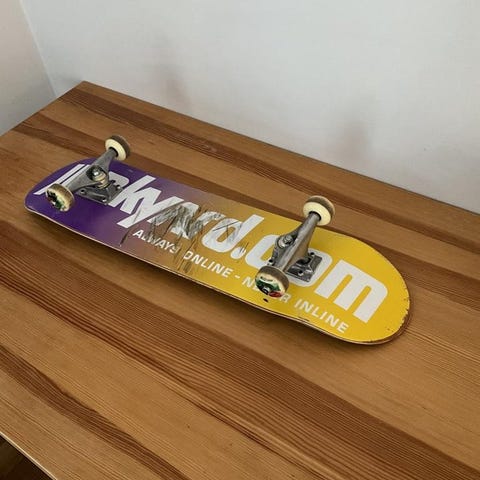 Skateboard Chevy Skate Battle Version ca 80x20 cm. Brädan har svart grepptejp och ljusblå undersida med tryckt grafik. Skicket visar tydliga spår av användning med repor och slitage i trycket. Rullar bra.