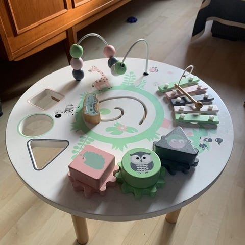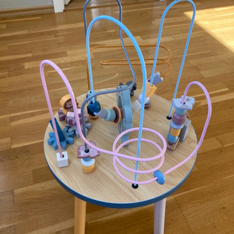 Roligt aktivitetsbord med flera motorik- och koordinationsträningar. Bordet har klossar som passar i olika former, en kulbana, roterande delar och ett litet xylofonparti med klubba.