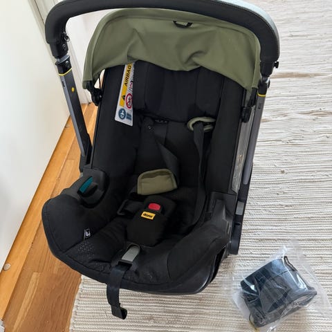 Doona babyskydd för barn upp till cirka 13 kg. Bilbarnstolen är i svart utförande och kombinerar babyskydd med integrerat chassi och hjul, vilket gör att den kan användas både i bilen och som vagn vid kortare förflyttningar. Sätet har fempunktsbälte, sidokrockskydd och justerbart bärhandtag. Passar bakåtvänt i bilen och är avsett för spädbarn och småbarn inom viktklassen för grupp 0+ (upp till 13 kg).