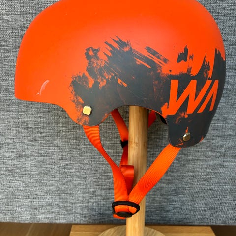 Bluegrass Superbold hjälm i storlek small, 51–55 cm. Hjälmen är vit med rosa och svarta dekorativa mönster på sidor och bak. Modell G06, certifierad enligt EN1078. Ventilationsöppningar upptill för luftflöde. Passar exempelvis cykling, skateboard eller annan liknande aktivitet där hjälm rekommenderas. Mindre synligt slitage i form av repor finns från tidigare användning.