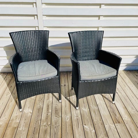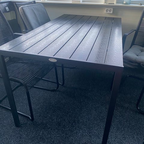Matbord med stolar i neutral design. Bordet har rektangulär bordsskiva i grå ton med raka ben. Till bordet finns div stolar i olika utföranden, både med och utan armstöd. Passar som matgrupp ute eller uterum.