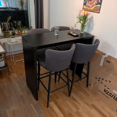 Barbord med integrerad förvaring på sidorna och tre barstolar. Bordet är vitt med öppna hyllplan på kortsidorna, lämpligt för förvaring av glas, porslin eller dekoration. Barstolarna har grå stoppad sits med ryggstöd och svart rund fot med pelarben. Passar som matplats eller avlastningsyta i kök eller vardagsrum, särskilt i mindre utrymmen där extra förvaring är önskvärd.