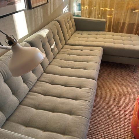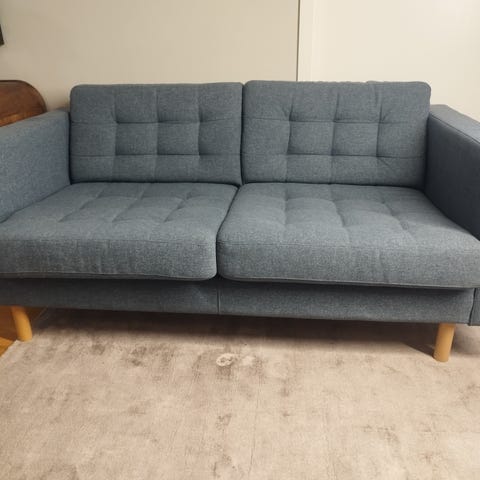Selling an Ikea sofa in dark grey with natural wooden legs in very good condition.