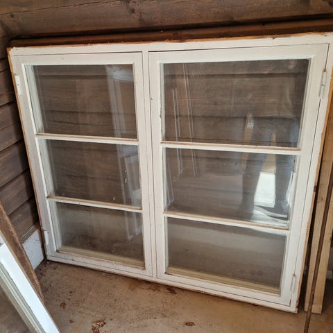 Liggande fönster med vit karm och två glaspartier i gott skick.