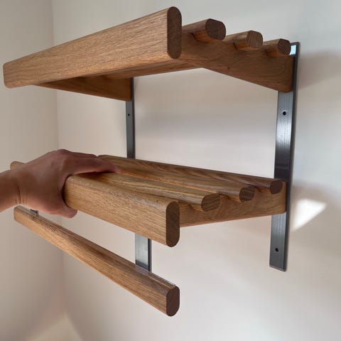Restaurerad hatthylla från Ulf Scherlin. Svensk design gjord i Sverige. Säljes pga flytt. Rek.pris va 3700kr. Beslagen behöver sprayas på nytt. 3 galgar i samma bets medföljer. 315x315mm väggfästets höjd 400mm.