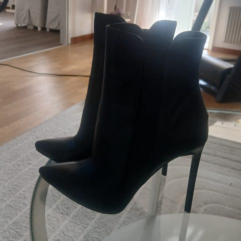 Campiano stövlar i svart färg. Modellen har hög smal klack och spetsig tå. Stövlarna är knähöga med dekorativ snörning längs sidan som ger en öppen struktur. Storlek 42. Passar till exempelvis fest och andra tillfällen där en mer klädd sko önskas.