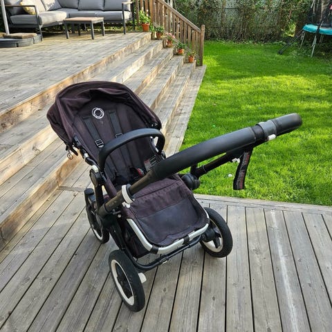 Bugaboo donkey duo syskonvagn med två sittdelar i svart textil (dock solblekt).