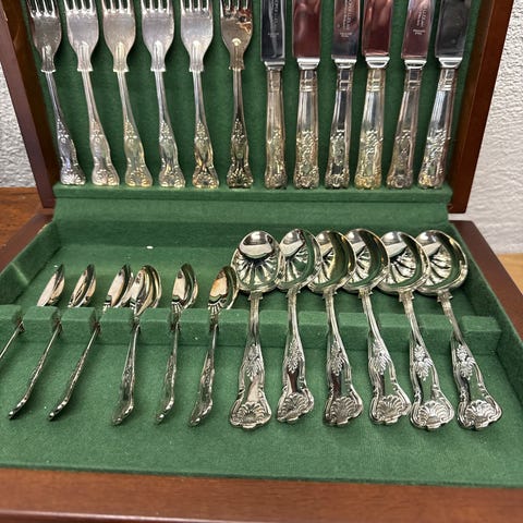 Clarfield bestickset i originalask. Setet innehåller knivar och gafflar med dekorerade skaft. Besticken ligger i en fodrad ask märkt med juvelerare K. Proffen, Einbeck. Passar som matbestick eller serveringsbestick. Antal delar 6 gafflar o 6 knivar.