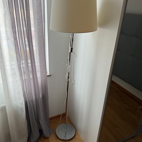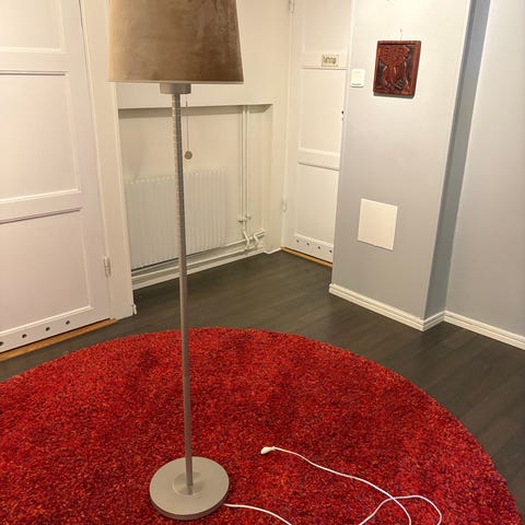 Golvlampa med off-white lampskärm, 110cm hög och 20cm i diameter.