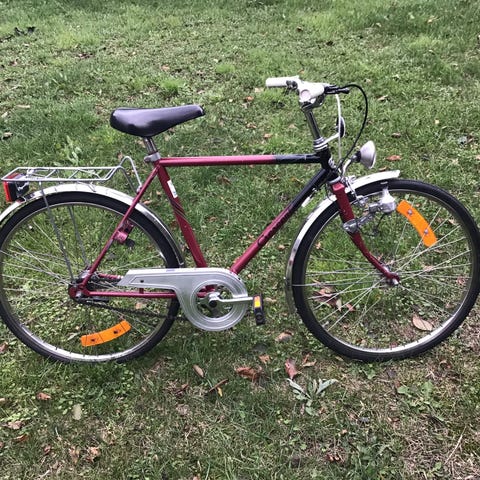 Cykeln har en fin patina, känns stadig och rullar lätt. Fullt cyklingsklar