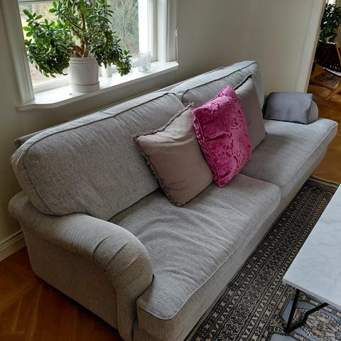 Två soffor i manchesterliknande tyg. Avtagningsbar klädsel vid behov av tvätt.