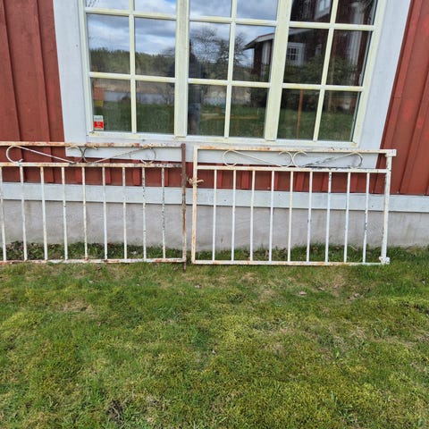 Järngrind med fina dekorationer och smidigt handtag. 87 cm hög och 144 cm bred (exl. handtag och fästen). Den behöver bara lite färg för att komma till sin rätt 😀