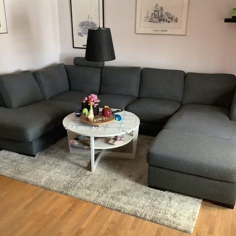 Mycket välskött svart hörnsoffa med divan i Cortiga tyg.