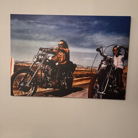 Stor litografi med motiv av tjej på motorcykel och reklam för jeans m.m. Det är en 70x100 cm lito framställd på en enfärgs Heidelberg tryckpress för drygt 30 år sedan. Sex färger med mycket arbete på kornerad film och zinkplåt. Ramyttermått är 102 x 75 cm, bred metallram ihopskruvad med muttrar. Från 1994. Signerad och numrerad. Pris eller bud. Finns nära Zinken.