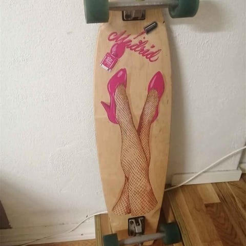 Stone Surf longboard i trä med naturfärgad bräda och tryck med palmmotiv. Brädan har drop-through-montering för truckarna och en lätt konkav form. Hjul i gul/orange färg med texten Ape Vernon Wheels. Passar för cruising och pendling på jämna underlag. Sälj eftersom att den knappt har används sedan köp.