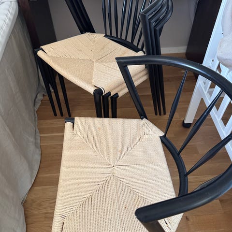 Säljer 2 st matstolar, då vi köpte mindre matbord. Stolarna är inköpta april 2025. Kvitto finns. Nypris 620kr.
