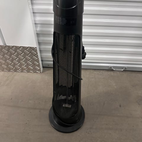 Gasolkamin i svart utförande. Fristående modell med skyddsgaller framtill och plats för gasolflaska på insidan. Lämplig för uppvärmning av exempelvis garage, förråd eller andra ventilerade utrymmen där gasolvärme är godkänd att använda.