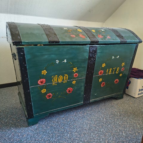 Gammal fin kista som funnits i familjen i evigheter, oklart var den kommer ifrån. Har använts till förvaring av bland annat glas. Behöver kanske målas ett varv på insidan då jag tycker att den luktar lite av den gamla färgen. Nyckel saknas till låset.