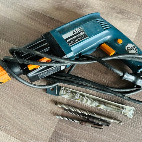 Kraftfull borrmaskin,750 W. Borrar i allt inkl slagborr för betong/sten. Pris 600 kr.