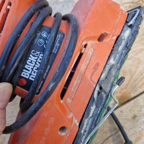 2) Black & Decker bandslip (KA88 enligt märkning). Bandslipmaskin med dammbehållare och flera slipband. Avsedd för slipning av trä och andra lämpliga material på plana ytor. Pris 500 kr.