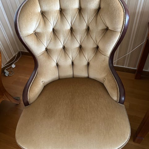 Fåtölj och soffa i klassisk, stoppad modell med hög rygg. Klädda i beige mönstrat tyg med knapptuftad rygg och träram i böjd form. Möbelben i trä. Passar som sittgrupp i vardagsrum eller som accentmöbler i exempelvis sovrum eller hall. Ca 50-tal. Vill inte slänga dem utan ser helst att de hamnar hos någon som vill renovera dessa.
