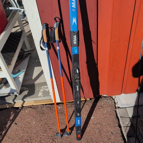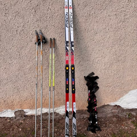 Uppsättning för turskidåkning bestående av turskidor med bindningar, tillhörande stavar . stighudar. Höga kängor.Skidorna är utrustade med bindningar anpassade för turåkning. Stavarna har längdmarkering upp till cirka 155 cm. Stighudarna levereras i separata skyddsfodral. Kängorna är höga med snörning och ger stöd för fot och ankel vid turåkning eller vandring i snö. Lämpligt som komplett paket för turskidåkning och vinterfriluftsliv.