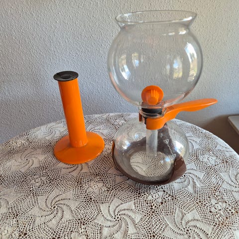 Bodum s kaffebryggare Don Pedro inköpt på 70 talet. Med orangea plastdetaljer. Fint skick med tanke på dess ålder.