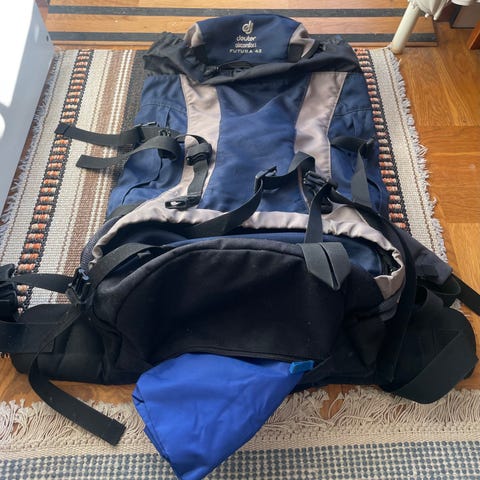 Vaude Hidalgo 42+8 vandringsryggsäck 50 liter i blå färg med flera justerbara remmar och fack. Ryggsäcken är avsedd för vandring eller friluftsliv och har bärsystem med höftbälte och bröstrem för bättre viktfördelning. På bilderna syns även liggunderlag, termos och ett master som ingår i utrustningen. Det är bara och skriva om ni har några frågor