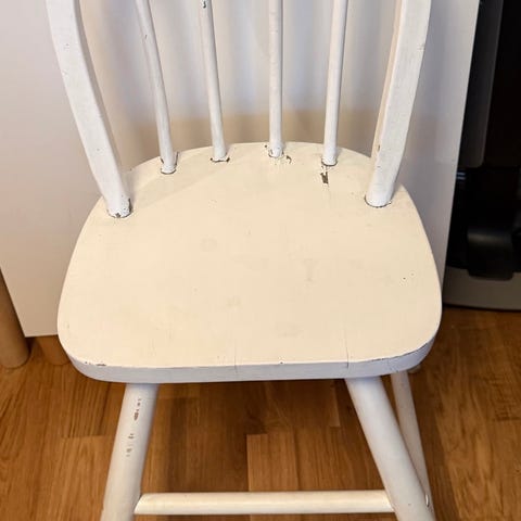 Barnstolar i trä, en i naturfärgat trä och en vitmålad. Klassisk modell med ryggstöd och sits anpassad för barn. Passar till barnrum, lekhörna eller vid ett mindre bord för pyssel och måltider. Gymnastikredskapet är dekorativt hemma och passar för lek