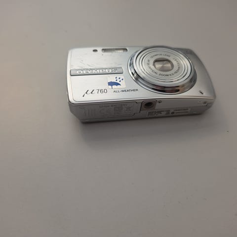 Olympus µ 1200 kompaktkamera i svart. Digital kamera med inbyggd blixt och zoomobjektiv. Baksidan har LCD-skärm och knappar för meny, zoom och uppspelning. Kameran är avsedd för vardagsfotografering och resor. På bilderna syns även handledsrem, laddare, kablar och fodral, vilket kan ingå beroende på vad som följer med vid försäljning.