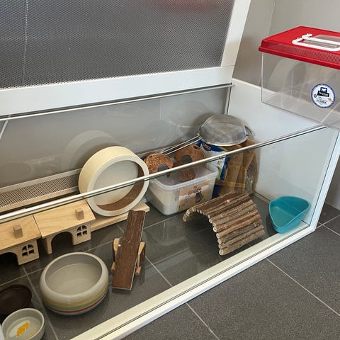 Hamsterbur i glas (går säkert att använda till andra djur också) med diverse olika tillbehör.