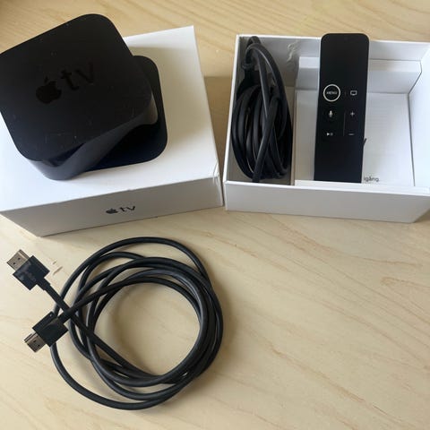 Apple TV mediaspelare i svart färg med tillhörande fjärrkontroll. Enheten ansluts till TV via HDMI för strömning av digitalt innehåll som film, serier och musik från kompatibla tjänster och Apple-enheter. Fjärrkontrollen har navigationsknappar och menyknapp för styrning av gränssnitt och uppspelning.