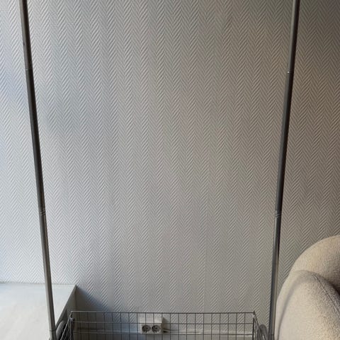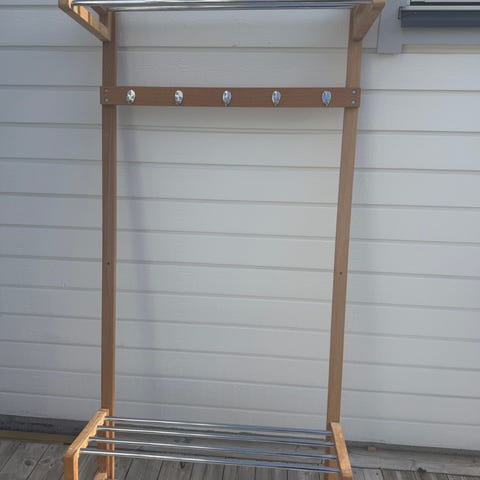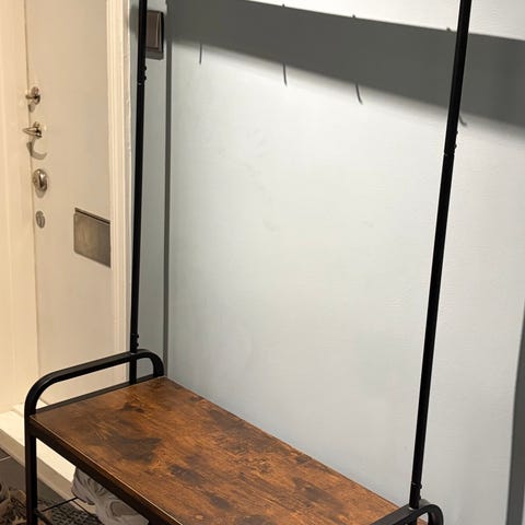 Praktisk och snygg klädställning i vit metall med detaljer i trä. Perfekt för hallen eller sovrummet med plats för både galgar och förvaring. Inbyggd bänk/hylla samt skohylla nedtill ger extra funktion. Stabil och i fint skick. Mått: 73x34x182 cm.
