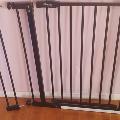 Hard Head Children barngrind i metall, vit. Grindens bredd är justerbar mellan 72,5 och 83,5 cm. Den är förlängningsbar och kan öppnas i båda riktningarna. Avsedd för att spärra av dörröppningar eller liknande utrymmen där barn inte ska ha fri tillgång.
