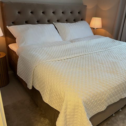 Mille Notti Bianca sänggavel i linnetyg i färgen ivory. Bredd 180cm. Nypris 10 300.