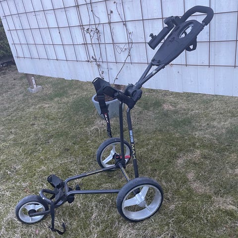 Golfvagn i trehjulig enklare modell i svart färg. Vagnen har handtag med hållare för scorekort, förvaringsfack, koppling till paraplyhållare och fotbroms. Konstruktionen är hopfällbar och hjulen kan enkelt tas av för enklare transport och förvaring. Stora hjul ger stabilitet och underlättar körning på olika underlag.