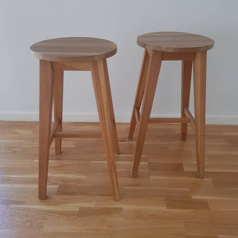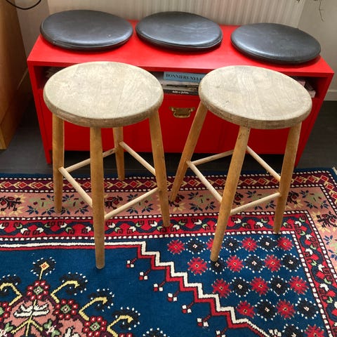2 nostalgiska 50/60-talspallar, stadiga och hela med älskat bruksslitage/patina.