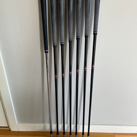 Callaway X18 golfklubbor järnset 3 4 5 6 7 8 9 P S samma serie. Klubborna har svarta skaft med RCH-markering och klubbhuvuden. Herr höger.