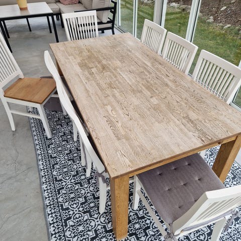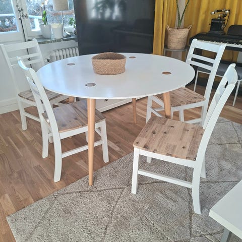 Matgrupp i mycket bra skick, diam bord 110cm med höjd ca 75cm. Vitlaserad ek med vitlackerade ben. Avhämtas.