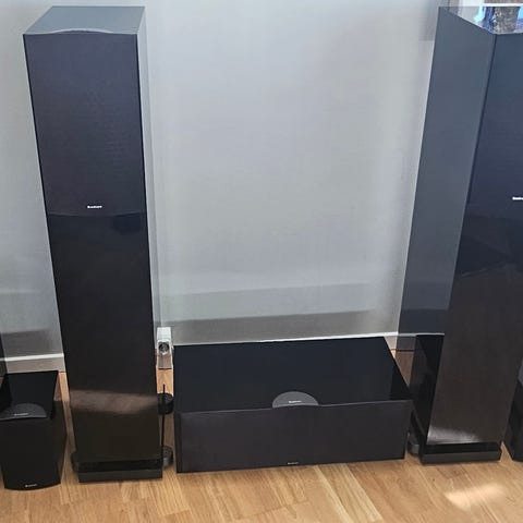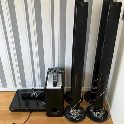 Philips i svart färg med 2stora golvstående högtalare, en subwoofer samt tre mindre det finns ingen förstärkare