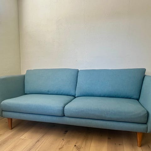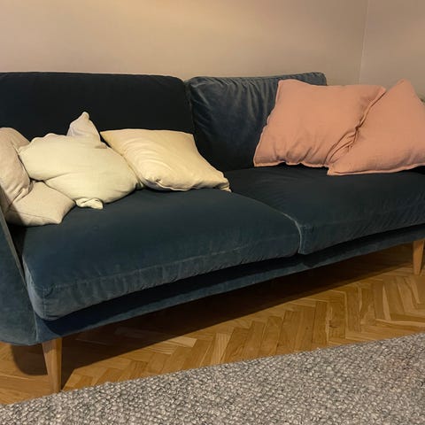 Soffa från Stalands möbler, modell Smile Day. Mörkblå klädsel, ben i trä. Nypris 14 485 kr. Hämtas i Årsta.