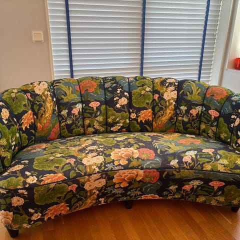 En trevlig lättplacerad 2-sitssoffa i i ljusbeige med mönster i ljusgrönt. Svartmålade träben och svängd rygg. Använd men ändå i gott skick, se bilder.