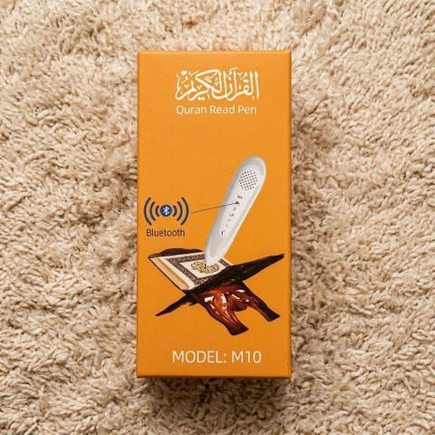 Komplett Paket: Inkluderar själva läspennan (8GB minne, laddningsbar), en vacker tryckt Koran, samt flera extra böcker (Qaida Noorania, Sahih Muslim, Sahih Al-Bukhari, reseparlör m.m.) som pennan också fungerar med!