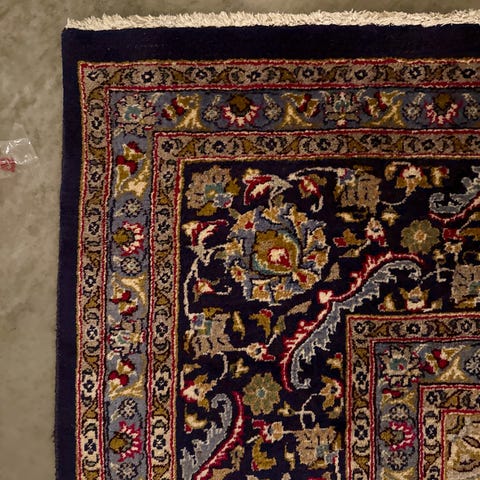 Säljer en mycket stor och vacker äkta persisk matta i klassiskt mönster. Handknuten med detaljerade blommotiv och djup mörkblå botten.