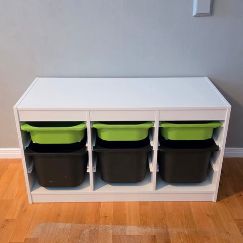 Vi säljer sonens förvaringshylla trofast med ljusgrå lådor. Lämplig för förvaring av leksaker, pysselmaterial eller andra barnrelaterade saker i barnrum eller lekhörna.