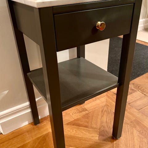 Äldre sängbord – målat i svart, med små söta mässingsknoppar. Två små hål baktill för sladdar.