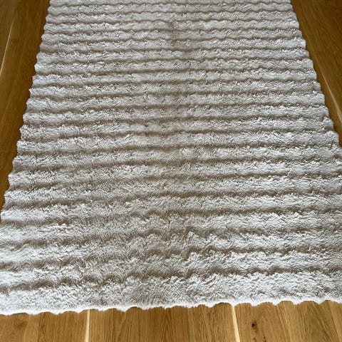 Recycled jeansmatta i blå toner. Mattan är vävd av återvunna jeansmaterial vilket ger ett melerat utseende med varierande nyanser. Passar som golvmatta i exempelvis vardagsrum, hall eller sovrum. Materialet är textil med tydlig struktur och fållade kanter.