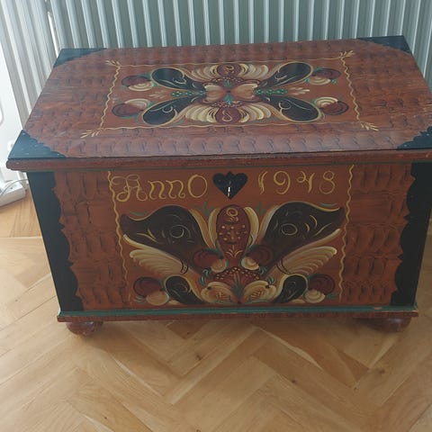 Allmoge brudkista i trä med handmålad dekor. Lämplig som förvaringsmöbel eller dekoration i hemmet.