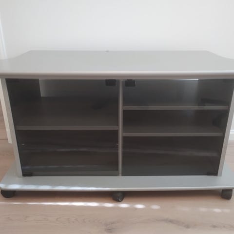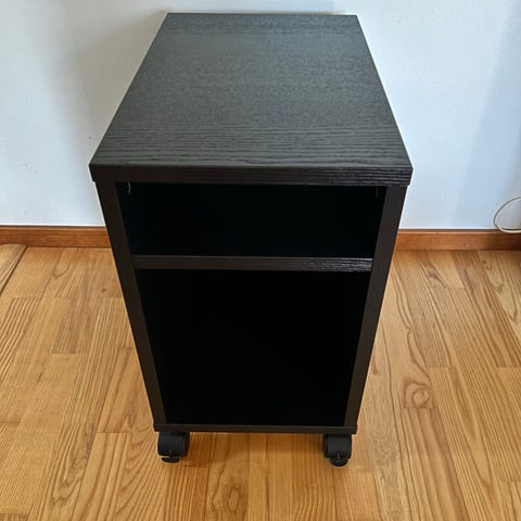 Hål på baksidan för att kunna dra igenom sladdar. Gråaktig med ljust trä.