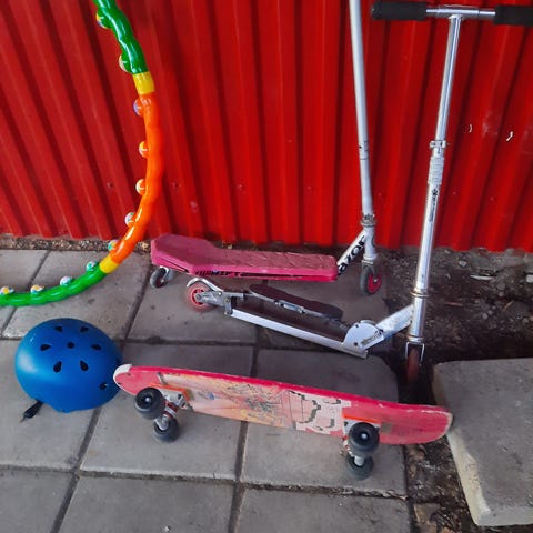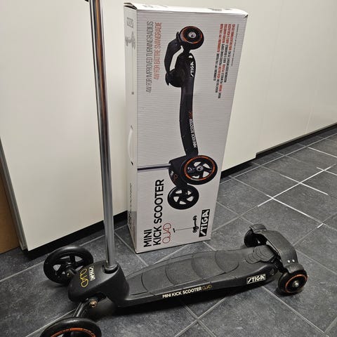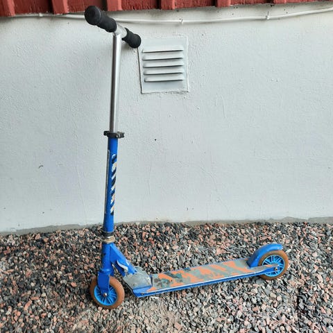 Sparkcykel för barn i två färger, blå och ljusgrön. Båda sparkcyklarna har justerbart styre i metall med svarta handtag och fotplatta med grepptejp. Utrustade med två hjul och bakre fotbroms. Passar för kortare turer och lek på plana underlag för barn som kan stå stadigt på en sparkcykel.